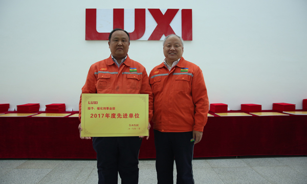圖為董事長為先進(jìn)單位催化劑事業(yè)部頒獎(jiǎng)。